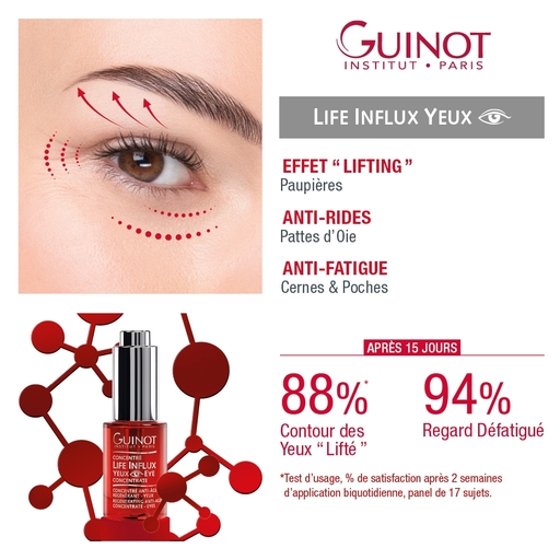 Pour répondre à ce besoin majeur, Guinot dévoile le nouveau Concentré Life Influx Yeux, le soin anti-âge haute performance qui régénère la peau et redonne un regard visiblement plus jeune.